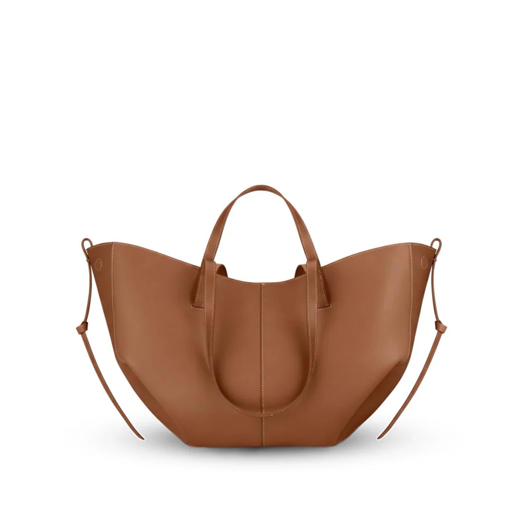Sculptural curves meet everyday utility in a rich tan finish. This winged tote creates a bold, geometric silhouette that elevates any look from simple to sophisticated. It is architectural minimalism at its finest.